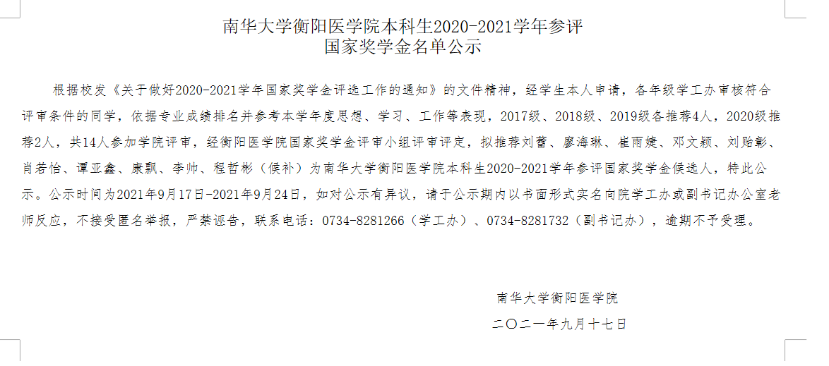 南华大学2020—2021学年度国家奖学金获奖学生建议名单表