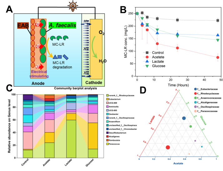 微囊藻毒素结构稳定、毒性强,对生态系统和人类健康构成重大威胁。杨飞教授团队前期筛选了一株粪产碱杆菌Alcaligenes faecalisD04,能够在厌氧条件下降解MC-LR,然而其降解效率有限。研究团队创新性地将该菌株接入微生物燃料电池,通过电极高效调控藻毒素降解,增强A. faecalisD04能量代谢与降解活性。相关研究以“Electrochemical Stimulation ofAlcaligenes faecalisD04 Enhances Anaerobic Degradation of Microcystin-LR in Microbial Fuel Cells”为题发表于Chemical Engineering Journal。