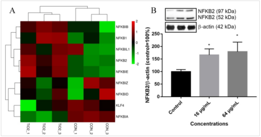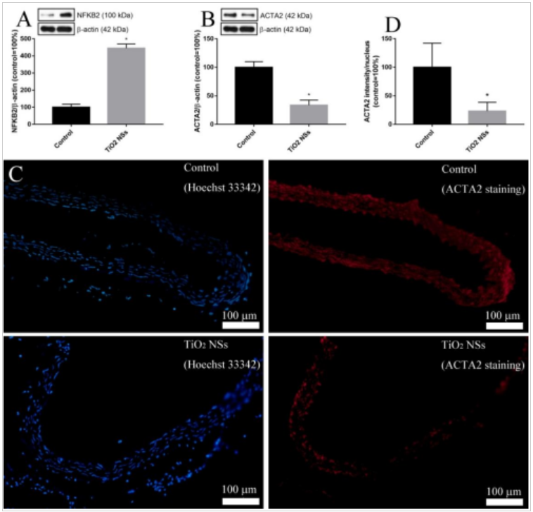 此前有研究发现,钛基纳米材料虽然没有急性细胞毒性,但可以通过影响核转录因子的表达导致血管内皮细胞功能发生异常,进而导致对血液循环系统的潜在毒性。血管是由多种细胞组成,钛基纳米材料对组成血管的其它重要细胞的作用值得深入研究。在这项研究中,曹毅老师团队合成了一种比表面积大的二氧化钛纳米片,并分析了这种材料对血管平滑肌细胞转化的影响。通过转录组技术分析发现,二氧化钛纳米片虽然没细胞急性毒性,但其改变了平滑肌细胞的功能与转化相关的信号通路。该团队进一步分析与平滑肌细胞转化相关的核转录因子,率先发现二氧化钛纳米片显著上调了核转录因子NFKB2(图1),导致血管平滑肌细胞发生转化。由于平滑肌细胞转化是许多与血液循环疾病发生(例如动脉硬化)的先行事件,这项研究提示了二氧化钛纳米片的潜在的对血管的毒性以及对血液循环系统疾病发生的可能的促进作用。