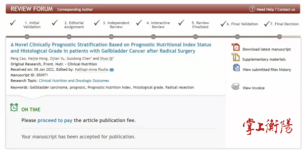 最美人间四月天,南华大学附属第一医院肝胆胰外科捷报传来。在肝胆胰外科学科带头人陈国栋副院长的指导下,齐硕博士和曹鹏主治医师于2022年04月05日在《Frontiers in Nutrition》上发表学术论文一篇。该论文基于临床数据资料—临床预后营养指数(PNI)及病理学分级构建了一种新型胆道恶性肿瘤预后研究模型,该模型具有极好预测精准度,可以对临床上胆道恶性肿瘤的治疗、预后的判断提供一种重要的技术手段。