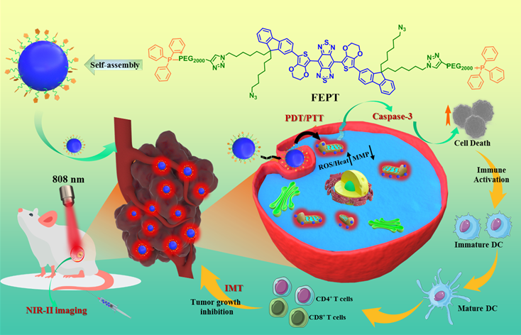 现阶段抗肿瘤的临床治疗效果会受到耐药性和癌细胞转移扩散的影响。线粒体作为细胞能量工厂,参与细胞代谢、信号传导、分化、生长、凋亡和死亡等多个重要生理过程。靶向线粒体抗肿瘤能够调控线粒体代谢,是一种高效、低毒的抗肿瘤策略。鉴于此,该研究团队构建了一种具有线粒体靶向性的NIR-II光敏剂分子(FEPT),其利用三苯基膦的靶向作用,有效地将光敏剂定位于线粒体中。在808 nm激光照射下,FEPT可展现优异的光动力学(PDT)和光热(PTT)性能,能在肿瘤细胞线粒体内产生大量活性氧(ROS)以及热量,从而引起线粒体损伤。在异种移植小鼠模型中,PDT/PTT可成功诱导肿瘤细胞免疫原性死亡,从而发挥免疫治疗(IMT)作用,以实现PDT /PTT /IMT三重联合抗肿瘤治疗。该工作为NIR-II成像引导靶向线粒体抗肿瘤治疗提供了一种新的分子诊疗策略。