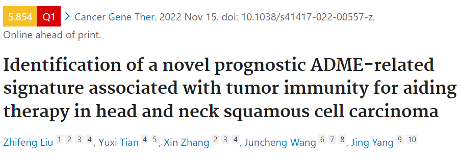 近日,附属第一医院耳鼻咽喉科刘志锋博士在国际知名期刊《Cancer Gene Therapy》(JCR 1区,中科院二区,2022年影响因子5.854)发表原创性研究论文:识别与肿瘤免疫关联的ADME相关新预后特征,以辅助头颈部鳞状细胞癌的治疗(Identification of a novel prognostic ADME-related signature associated with tumor immunity for aiding therapy in headneck squamous cell carcinoma)。
