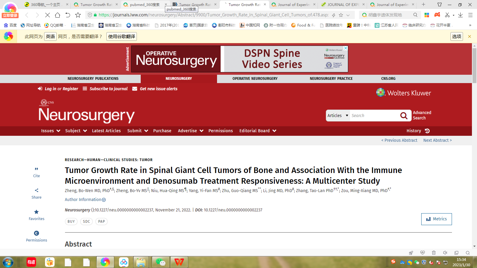 近期,南华大学附属第一医院联合北大人民医院、中南大学湘雅医院、湘雅二医院等5个临床医学中心在中科院一区Top期刊《NEUROSURGERY》(2022年IF:5.315)发表多中心临床研究论文——“脊柱骨巨细胞瘤的肿瘤生长速率及其与免疫微环境和地诺单抗治疗反应的关系:一项多中心研究(Tumor Growth Rate in Spinal Giant Cell Tumors of Bone and Association With the Immune Microenvironment and Denosumab Treatment Responsiveness: A Multicenter Study)”,我院为该研究论文的第一署名单位,Dr.张陶蓝、Dr.邹明向为本研究论文的共同通讯作者。