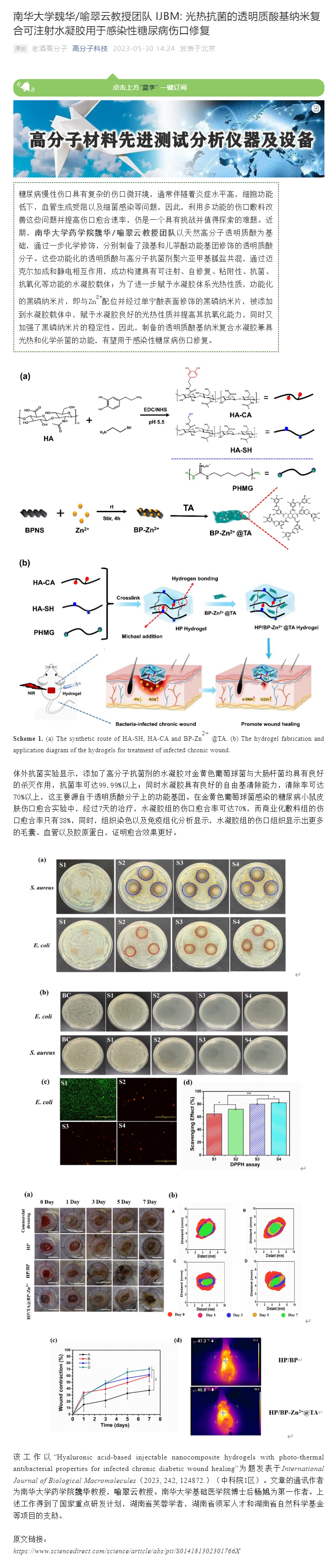 糖尿病慢性伤口具有复杂的伤口微环境,通常伴随着炎症水平高,细胞功能低下,血管生成受阻以及细菌感染等问题,因此,利用多功能的伤口敷料改善这些问题并提高伤口愈合速率,仍是一个具有挑战并值得探索的难题。近期,南华大学药学院魏华/喻翠云教授团队以天然高分子透明质酸为基础,通过一步化学修饰,分别制备了巯基和儿茶酚功能基团修饰的透明质酸分子。这些功能化的透明质酸与高分子抗菌剂聚六亚甲基胍盐共混,通过迈克尔加成和静电相互作用,成功构建具有可注射、自修复、粘附性、抗菌、抗氧化等功能的水凝胶载体;为了进一步赋予水凝胶体系光热性质,功能化的黑磷纳米片,即与Zn2+配位并经过单宁酸表面修饰的黑磷纳米片,被添加到水凝胶载体中,赋予水凝胶良好的光热性质并提高其抗氧化能力,同时又加强了黑磷纳米片的稳定性。因此,制备的透明质酸基纳米复合水凝胶兼具光热和化学杀菌的功能,有望用于感染性糖尿病伤口修复。