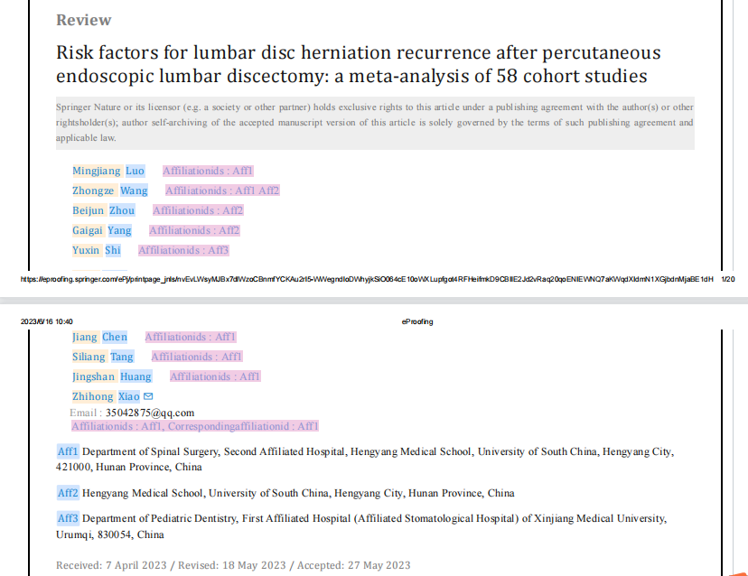 脊柱外科喜讯频传。近期,肖志宏博士带领骆明江同学对脊柱外科另一常见疾病——腰椎间盘突出症的内镜下切除术术后复发的危险因素进行了分析。该研究结果以标题为“Risk factors for lumbar disc herniation recurrence after percutaneous endoscopic lumbar discectomy: A meta-analysis of 58 cohort studies”,发表在《Neurosurg Review》(中科院3区)杂志上。
