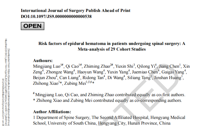 本月,南华大学附属第二医院脊柱外科曹奇主任、肖志宏博士团队在外科学领域顶级期刊《International Journal of Surgery》(JCR一区,IF=13.400)上发表了标题为“Risk Factors for Spinal Epidural Haematoma in Patients Undergoing Spinal Surgery: A Meta-analysis of 29 Cohort Studies”的高水平论文。