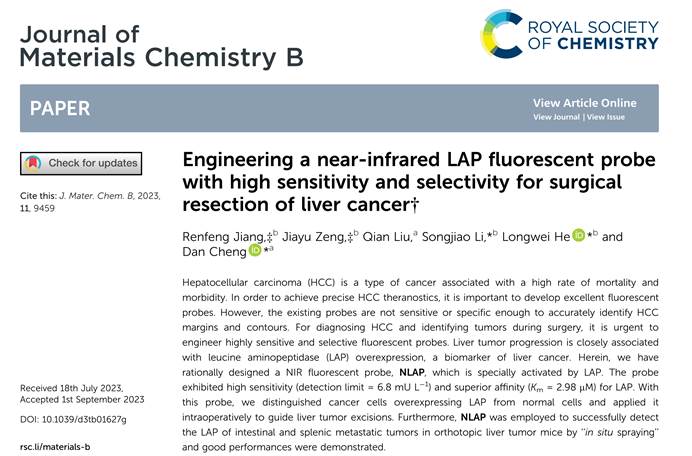 肝细胞癌(HCC)是一种与高死亡率和发病率相关的癌症。为了实现精确的HCC治疗诊断,开发优异的荧光探针非常重要。然而,现有的探头不够灵敏或特异,无法准确识别HCC的边缘和轮廓。为了诊断HCC并在手术期间识别肿瘤,迫切需要设计高灵敏度和选择性的荧光探针。肝脏肿瘤的进展与亮氨酸氨肽酶(LAP)过度表达密切相关,LAP也是肝癌的生物标志物。在此,我们合理设计了一种由LAP特异性激活的NIR荧光探针NLAP。该探针表现出LAP高灵敏度(检测限= 6.8 mU/L)和优异的亲和力(Km=2.98 μM)。通过NLAP,我们将过度表达LAP的癌细胞与正常细胞区分开来,并在术中应用它来指导肝脏肿瘤切除。此外,NLAP还通过“原位喷洒”成功检测原位肝肿瘤小鼠肠和脾转移瘤LAP,并表现出良好的性能。这一成果以“Engineering a near-infrared LAP fluorescent probe with high sensitivity and selectivity for surgical resection of liver cancer”为题于9月1日在线发表Journal of Materials Chemistry B上。南华大学药学院硕士研究生江仁峰和基础医学院博士研究生曾佳玉为本文的共同第一作者,南华大学药学院何隆薇教授、青年教师李宋娇与南华大学附属南华医院程丹教授为本研究论文的共同通讯作者。南华大学药学院和附属南华医院为通讯单位。文章链接:https://doi.org/10.1039/d3tb01627g。