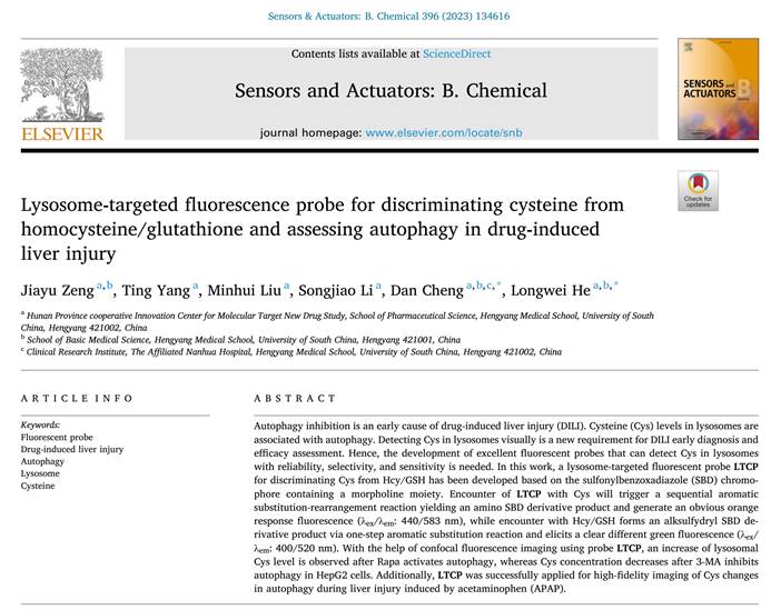 自噬抑制是药物性肝损伤(DILI)的早期原因。溶酶体中的半胱氨酸(Cys)水平与自噬相关。可视化检测溶酶体中的Cys是DILI早期诊断和疗效评估的新要求。因此,需要开发能够可靠、选择性和灵敏地检测溶酶体中Cys的优异荧光探针。在这项工作中,基于含有吗啉部分的磺酰基苯并恶二唑(SBD)荧光团,开发了一种用于区分Cys和Hcy/GSH的溶酶体靶向荧光探针LTCP。LTCP与Cys相遇会引发连续的芳香族取代重排反应,生成氨基SBD衍生产物,并产生明显的橙色响应荧光(λex/λem: 440/583nm),而与Hcy/GSH相遇时,通过一步芳香取代反应形成SBD衍生产物,并引发明显不同的绿色荧光(λex/λem: 400/520 nm)。在使用探针LTCP的共聚焦荧光成像的帮助下,在Rapa激活自噬后观察到溶酶体Cys水平增加,而在3-MA抑制细胞自噬后溶酶体Cys浓度下降。此外,LTCP还成功应用于对乙酰氨基酚(APAP)引起的肝损伤期间自噬过程Cys变化的高保真成像。该成果以“Lysosome-targeted fluorescence probe for discriminating cysteine from homocysteine/glutathione and assessing autophagy in drug-induced liver injury”为题于9月12日在线发表在Sensors and Actuators B: Chemical。南华大学基础医学院曾佳玉为本文第一作者。南华大学药学院何隆薇教授与附属南华医院程丹教授为本研究论文的共同通讯作者。南华大学药学院和附属南华医院为通讯单位。文章链接:https://10.1016/j.snb.2023.134616。