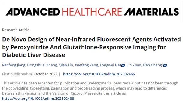 糖尿病及其并发症,如糖尿病肝病,已成为困扰人们健康的重大问题。对其病理过程中氧化还原状态的检测可以有效地帮助我们对疾病有更深入的了解。一对氧化还原物质过氧亚硝酸根离子(ONOO-)和谷胱甘肽(GSH)被认为与其发生发展密切相关。因此,ONOO-和GSH在糖尿病肝病中的直接可视化对于在分子水平上评估疾病至关重要。在此,我们基于近红外荧光团的羟基和氨基,通过保护与脱保护策略,制备了两种可激活的探针NTCF-ONOO-和NTCF-GSH,用于选择性检测ONOO-和GSH。观察了外源性和内源性ONOO-和GSH在活细胞和体内的动态荧光成像。重要的是,本研究可视化了糖尿病肝病细胞模型中的ONOO-和GSH水平,并探讨了该过程中与NAD+/NADH相关的可能的氧化还原失衡机制。此外,这两个探针可以灵敏地识别由链脲佐菌素和链脲佐菌素/对乙酰氨基酚诱导的糖尿病肝损伤引起的氧化应激过程中ONOO-和GSH含量的动态变化。此外,这些探针还可有效监测糖尿病患者的临床血清样品。这项工作将极大地促进与氧化应激事件相关的临床糖尿病肝脏疾病早期检测的发展。这一成果以“De Novo Design of Near-Infrared Fluorescent Agents Activated by Peroxynitrite and Glutathione-Responsive Imaging for Diabetic Liver Disease”为题于10月16日在线发表在Advanced Healthcare Materials。南华大学药学院硕士研究生江仁峰和附属南华医院青年教师张红帅为共同第一作者,南华大学药学院何隆薇教授和附属南华医院程丹教授为本研究论文的共同通讯作者。南华大学衡阳医学院药学院和附属南华医院为通讯单位。文章链接:https://doi.org/10.1002/adhm.202302466。