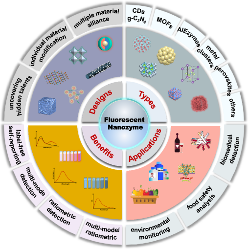 纳米酶除了类酶催化作用外,往往还具有诱人的光、电、热、磁等性质。作为纳米酶家族的新星,荧光纳米酶兼具类酶催化活性和发光特性,为生化传感等领域带来了新机遇,在过去几年里引起了越来越多的兴趣。为了突出这一领域取得的成就和研究进展,团队首次对荧光纳米酶及其在促进分析检测中的作用进行了全面综述。文章清晰界定了荧光纳米酶概念,深入剖析了其双重功能特性,系统介绍了常见设计策略,如挖掘材料潜能、单个材料改性、多种材料复合等,重点阐述了它们在生化分析中的独特贡献,以及在环境监测、食品安全分析、生物医学检测等领域的应用前景。最后,审慎评估了荧光纳米酶实现先进检测的潜力及现存挑战,并对未来研究进行了展望。文章将为深入理解荧光纳米酶及其应用提供参考,有望吸引更多科研力量推动该领域进一步发展。