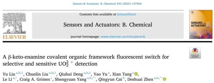 近日,南华大学甄德帅教授课题组在期刊Sensors and Actuators B: Chemical(中科院1区,Top,IF= 8.0)上发表了题为“A β-keto-enamine covalent organic framework fluorescent switch for selective and sensitive UO22+detection”的学术论文,这是课题组近期在荧光检测UO22+领域取得的新进展。李乐教授、杨胜园教授、甄德帅教授为通讯作者,南华大学为第一单位和通讯单位。