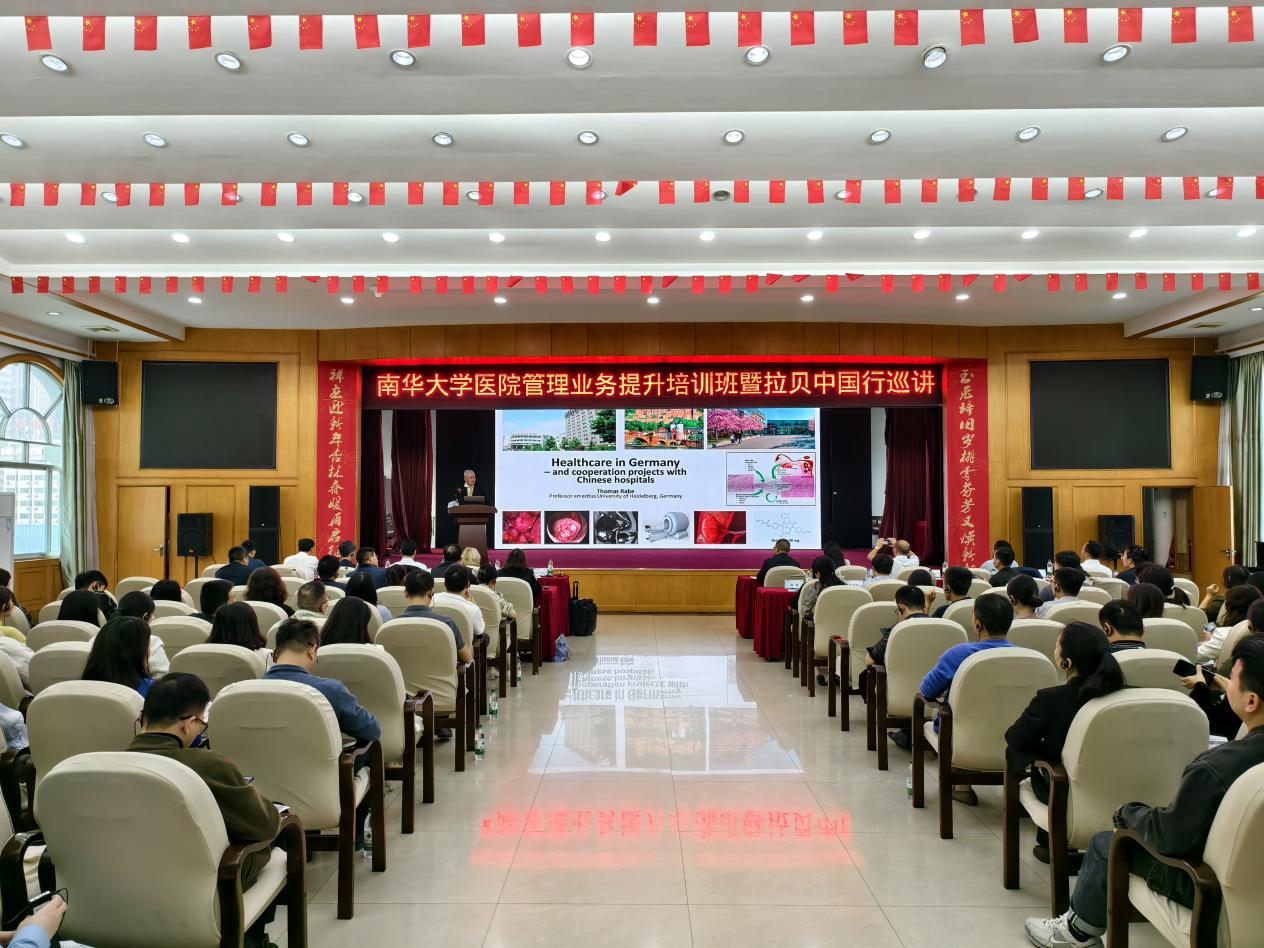 为深入学习贯彻党的二十大精神,不断加强国际交流与合作,进一步提升附属医院管理能力,促进医院高质量发展,11月5日,学校在南华大学附属第一医院综合楼8楼会议室举办南华大学医院管理业务提升培训班暨拉贝中国行巡讲,这是医院管理业务提升的第三期培训。此次培训邀请德国海德堡大学医学院教授托马斯·拉贝(Thomas Rabe)、中南大学湘雅医院综合评价中心主任张洁现场授课。南华大学副校长姜志胜出席培训班并致辞。
