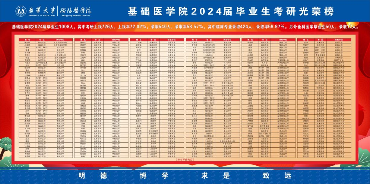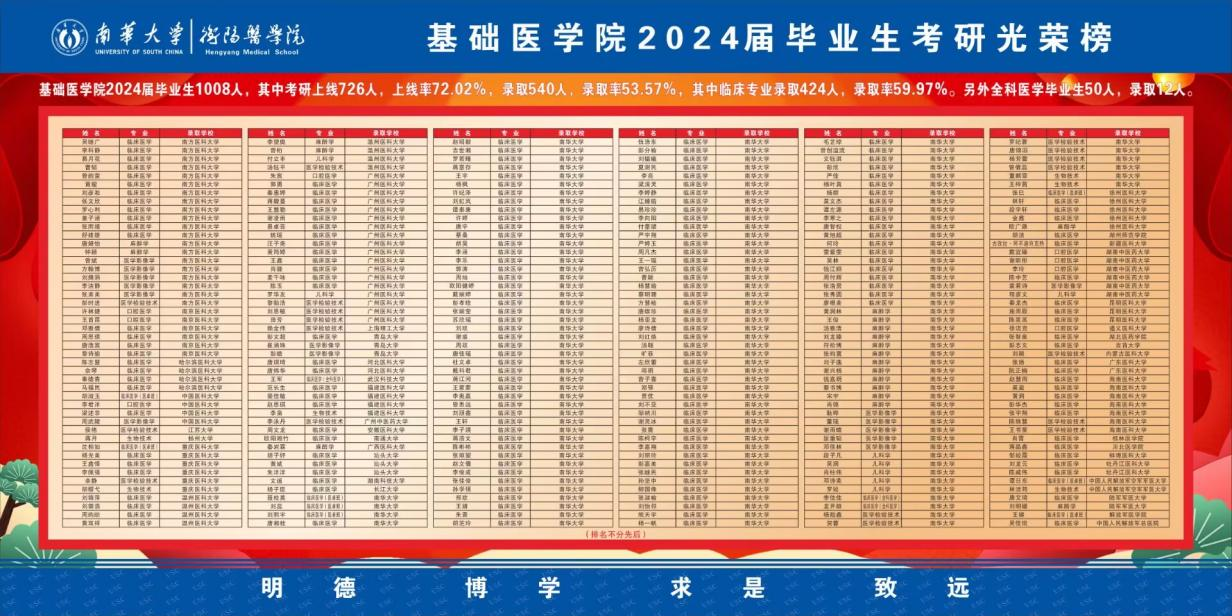 基础医学院2024届非定向毕业生1008人,其中考研上线726人,上线率72.02%,录取540人,录取率53.57%,其中临床专业录取424人,录取率59.97%;另外全科定向毕业生50人,录取12人。