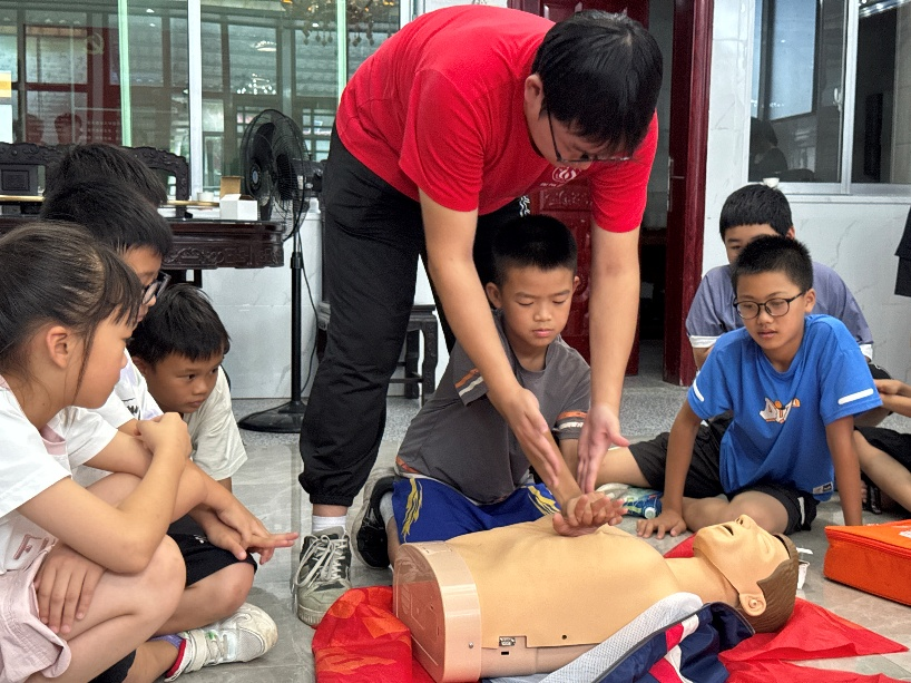 当老师示范完胸外按压标准动作,孩子们纷纷举手跃跃欲试。10岁的王若若(化名)更是急切地跳出来,指着假人胸口确认:“老师,是按这里对吗?”老师蹲下耐心指导,调整手势,讲解深度与频率。得到要领后,王若若有模有样地练习起来。其他孩子也全神贯注:有的手持AED模拟器反复确认电极片位置,有的紧盯同伴操作,遇到疑问立即举手请教。随着练习深入,孩子们逐渐掌握了基本急救要领,实用的知识转化为守护生命的能力。