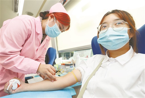 11月17日,南华大学校园内,大学生在献血车上献血。 当天是国际大学生节,南华大学衡阳医学院2021级大学新生通过参与无偿献血的方式,度过自己第一个大学生节。曹正平 李杨 摄影报道