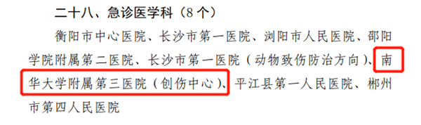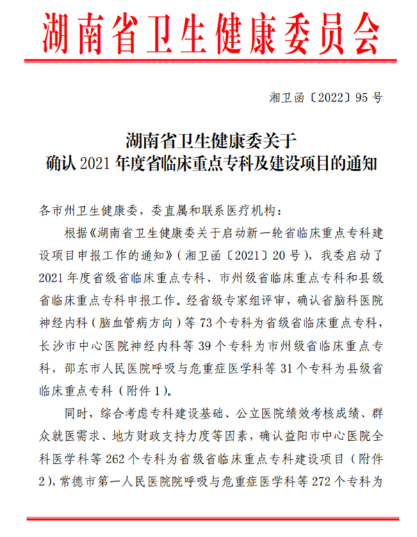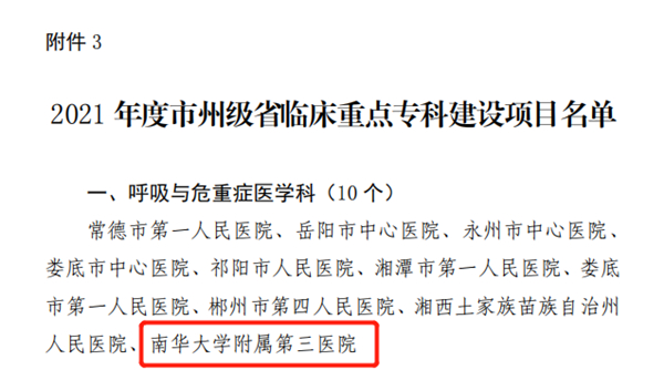 华声在线5月19日讯(通讯员 周辉 陈雨阳)5月18日,湖南省卫生健康委公布了关于确认2021年度省临床重点专科及建设项目的通知,南华大学附属第三医院呼吸与危重症医学科、急诊医学科(创伤中心)获批市州级省临床重点专科建设项目。此次中标市州级省临床重点专科建设项目,充分体现了医院部分专科具备很强的综合实力,标志着医院整体医疗技术水平和服务能力迈上了一个新台阶。