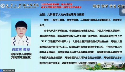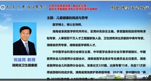 (文/韩璐 唐倩倩 郑海欣 图/夏文辉 唐倩倩)6月8日下午,南华大学衡阳医学院隆重举办儿科学高质量发展衡山论坛暨南华大学衡阳医学院儿科学专业毕业典礼。本次典礼特邀湖南省卫健委党组成员、副主任祝益民教授和湖南省教育厅高教处副处长王荣等领导前来指导,特邀中华医学会儿科学专业委员会主委王天有教授,重庆医科大学附属儿童医院院长李秋教授,浙江大学医学院附属儿童医院党委书记舒强教授,南华大学儿科学院院长肖政辉作主题讲座。本次典礼采取线上线下相结合的方式,本次论坛分为毕业典礼和衡山论坛两阶段。