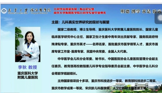 李秋教授作《儿科真实世界研究的现状与展望》讲座,她首先介绍了重庆医科大学附属儿童医院的基本情况,之后详细讲解了真实世界研究的定义、真实世界研究与随机临床试验的比较、儿童真实世界研究现状、真实世界研究的挑战与具备的基础、重医儿童医院真实世界数据研究基础。