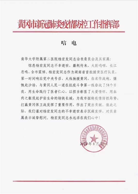 “惊悉杨宏发同志不幸逝世,噩耗传来,大别呜咽,长江悲鸣,全市震悼。”8月25日,在杨宏发因病离世3天后,一封落款为“黄冈市新冠肺炎疫情防控工作指挥部”的唁电,表示了沉痛哀悼。