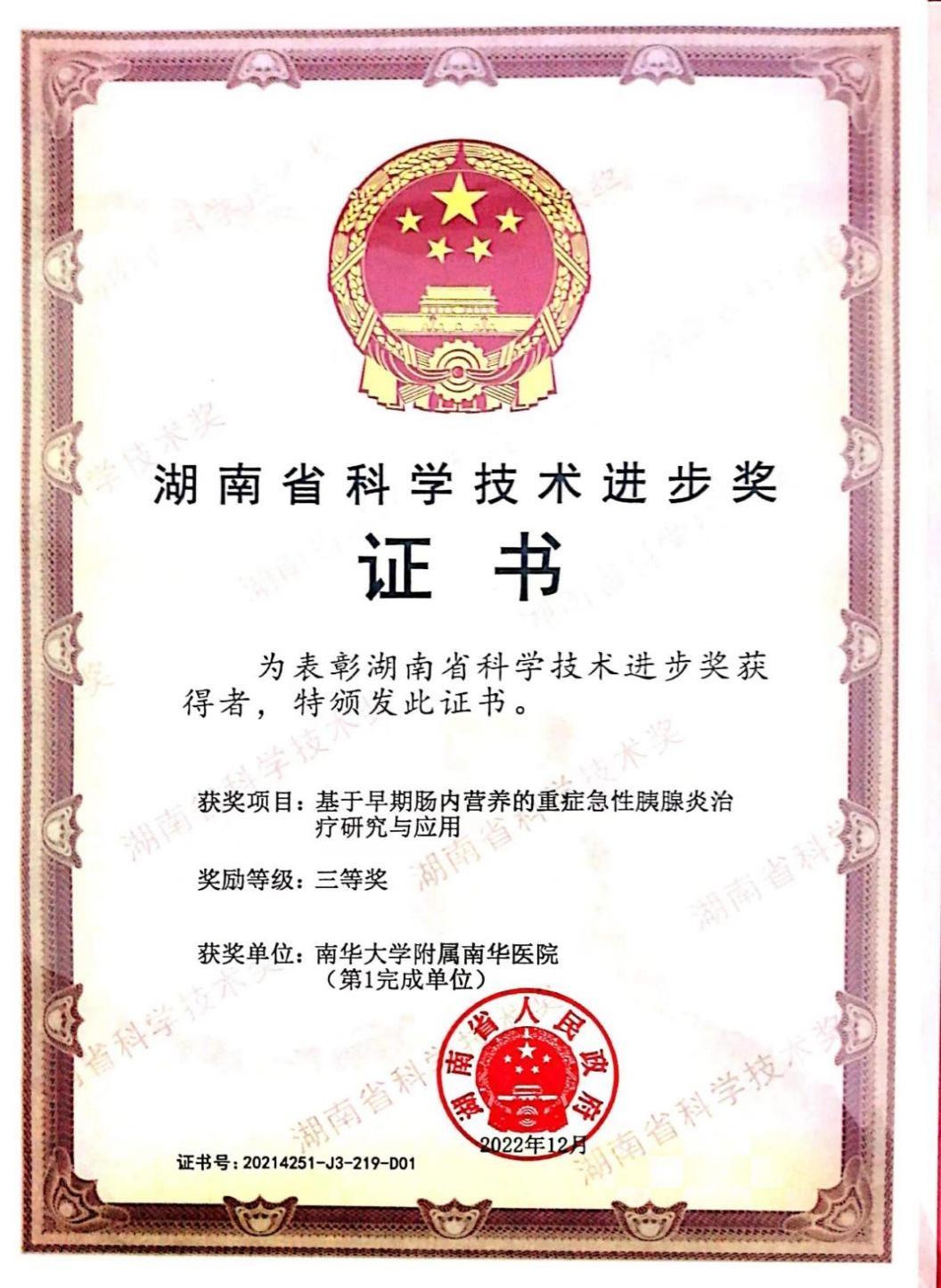 近期,在湖南省科技创新奖励大会上,南华医院党委委员、副院长刘龙飞带领团队研究的《基于早期肠内营养的重症胰腺炎治疗研究进展》获得湖南省科技进步三等奖。