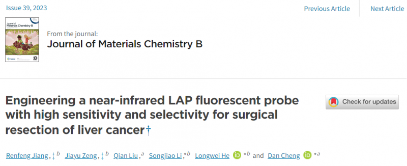 这一成果以“Engineering a near-infrared LAP fluorescent probe with high sensitivity and selectivity for surgical resection of liver cancer”为题于9月1日在线发表Journal of Materials Chemistry B上。南华大学药学院硕士研究生江仁峰和基础医学院博士研究生曾佳玉为本文的共同第一作者,南华大学附属南华医院程丹教授、南华大学药学院李宋娇博士与何隆薇教授为本研究论文的共同通讯作者,南华大学附属南华医院为该论文最后通讯作者通讯单位。