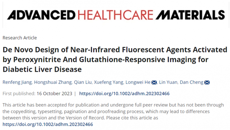 这一成果以“De Novo Design of Near-Infrared Fluorescent Agents Activated by Peroxynitrite and Glutathione-Responsive Imaging for Diabetic Liver Disease”为题于10月16日在线发表在Advanced Healthcare Materials上。南华大学药学院硕士研究生江仁峰和附属南华医院青年教师张红帅为共同第一作者,南华大学附属南华医院程丹教授和南华大学药学院何隆薇教授为本研究论文的共同通讯作者,南华大学附属南华医院为该论文最后通讯作者通讯单位。