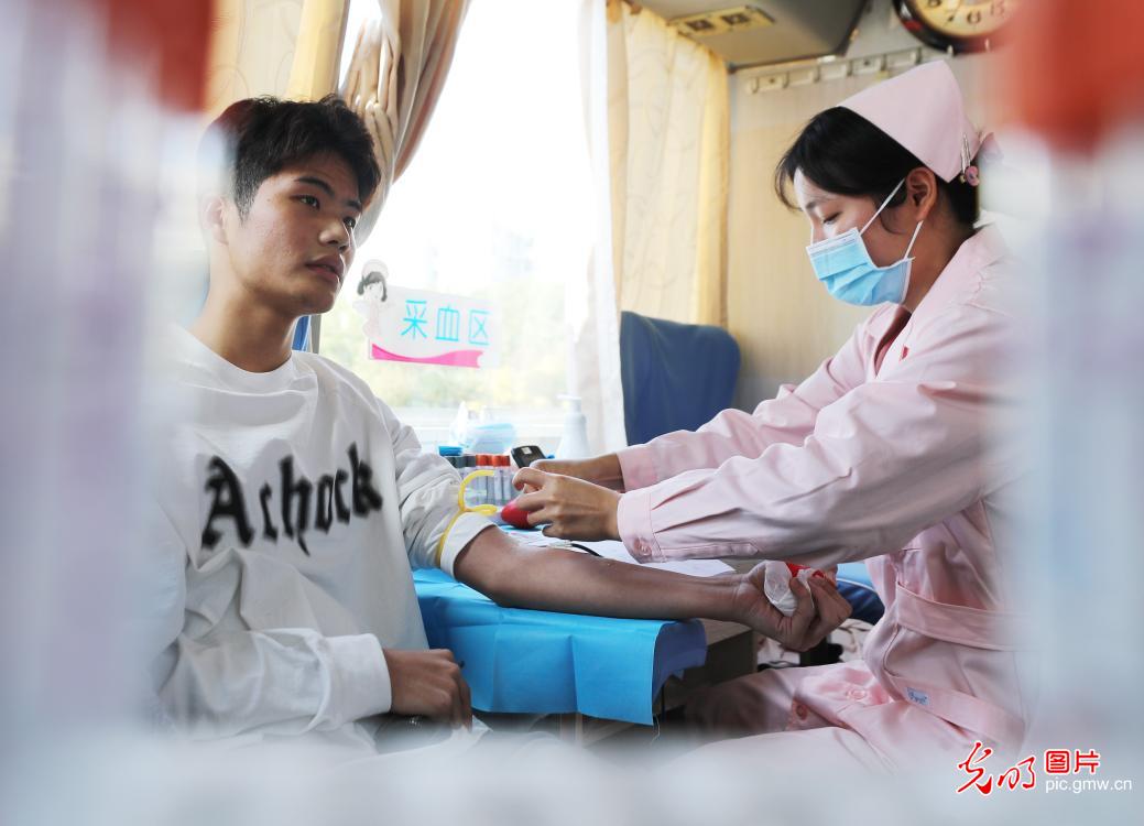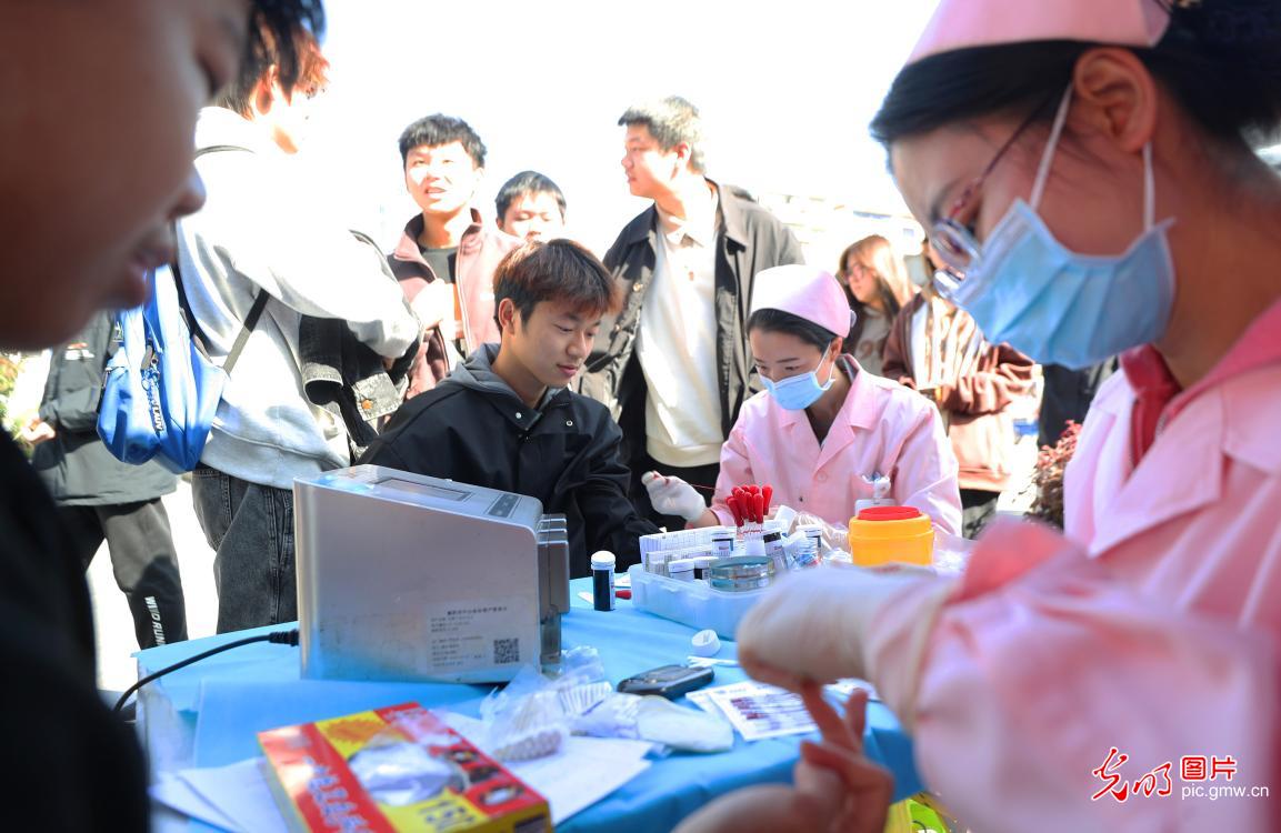 11月17日是国际大学生节,湖南省南华大学衡阳医学院在2023级大学新生中开展“献第一次血,过第一个大学生节、履第一次救死扶伤责任”的志愿无偿献血活动。(曹正平摄)