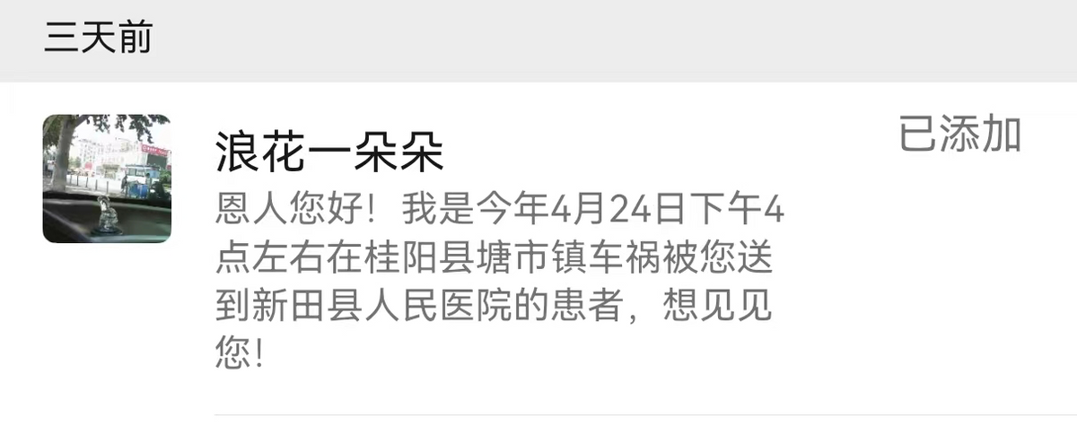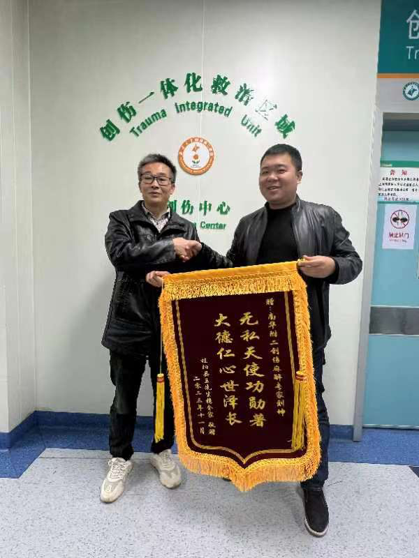 患者因受伤严重已经记不清当时发生的事件,但从他人口中得知是一名南华大学附属医院的医生救了自己。出于感激,他特意到新田县人民医院寻找刘坤医生的联系方式。11月26日患者从郴州赶来,只为表达他的深深感谢。