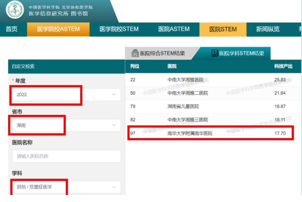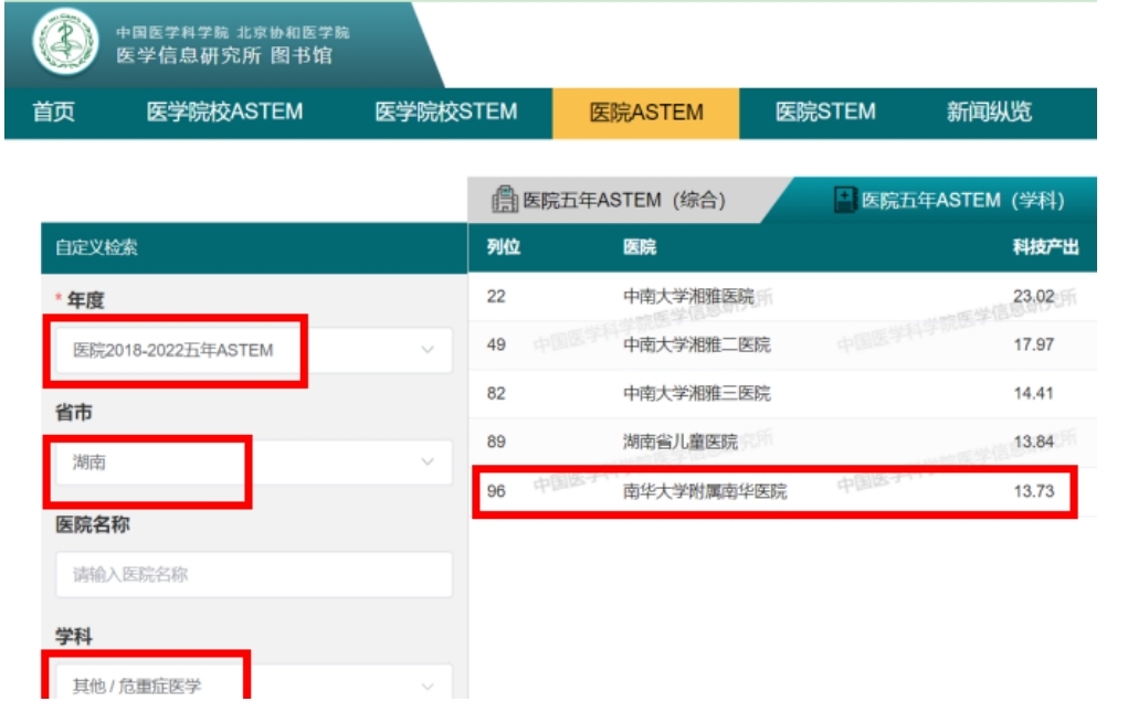 近日,从中国医学科学院、北京协和医学院医学信息研究所图书馆公布的最新数据中获悉,南华大学附属南华医院重症医学科在2018-2022年最新五年的总科技量值ASTEM(危重症医学)排名中,紧随省城强院之后,强势跻身全国百强,并位居全省第五名的佳绩。这一成绩不仅彰显了南华医院重症医学科在医疗领域的不俗实力,更是对其多年来在医教研协同发展方面不懈努力的高度肯定。