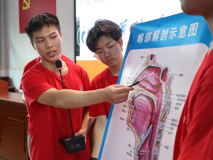 宣讲开始,实践团成员李泽彬与宋子豪以掏耳朵与晕车两个常见的小问题作为切入点,结合耳朵模型,与村民们互动,深入浅出地进行科普。他们以生动有趣的方式,从耳朵到喉咙,仔细向村民们介绍耳鼻喉中的各个部位以及一些疾病,包括中耳炎、鼻炎、咽喉炎等常见疾病的症状及识别方法。为了增强宣讲过程的互动性和趣味性,李泽彬和宋子豪准备了许多问题与在场的村民互动,现场气氛热烈。