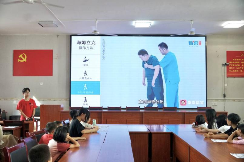 宣讲活动分为四大板块,实践团成员梁芊依次讲解了“消防安全无小事”“生活常见急救场景”“海姆立克急救法”以及“溺水——心肺复苏”等知识。实践团成员们通过PPT展示、视频播放、现场演示等多种形式,将复杂的安全知识转化为易于理解的语言和直观的操作步骤,让在场的每一位村民都能听得懂、学得会、用得上。