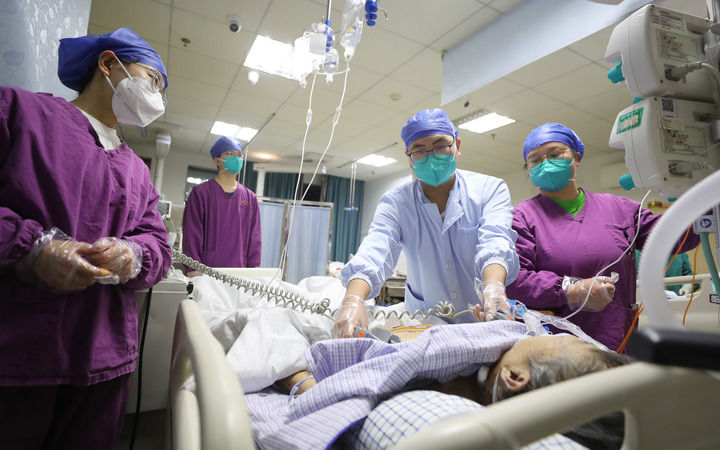 在湖南省衡阳市,南华大学附属第一医院ICU的医务工作者对患者进行救治(2023年1月22日摄)。(曹正平摄)