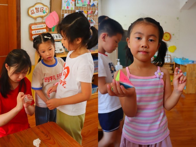 图3:图为志愿者在教小朋友们制作香囊与小朋友在展示自己制作的香囊