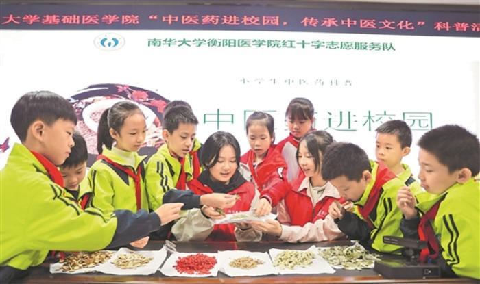 10月22日,在湖南省衡阳市蒸湘区实验小学,南华大学衡阳医学院红十字志愿服务队的志愿者教小学生们辨识中药材。