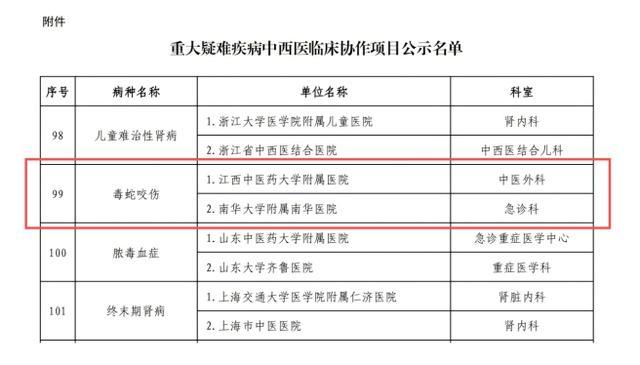 近日,国家卫生健康委、国家中医药局以及中央军委后勤保障部卫生局联合公布国家级重大临床协作项目。南华大学附属南华医院急诊科和江西中医药大学附属医院中医外科联合申报,成功获批国家级重大疑难疾病毒蛇咬伤中西医临床协作项目。