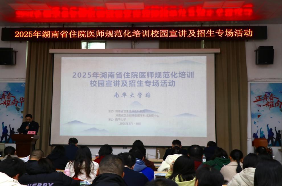 3月29日,湖南省住院医师规范化培训进校园宣讲及招生专题宣传活动在南华大学举行。活动由湖南省卫生健康委科教处及湖南省卫生健康委医学科技发展中心主办、南华大学承办,全省共29家培训基地参与,1500余名南华大学衡阳医学院临床医学生以线上线下形式参加。