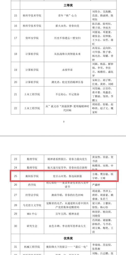 在激烈的角逐中,南华大学衡阳医学院研究生脱颖而出,斩获多项荣誉。学院共荣获2 个一等奖、1 个二等奖、1 个三等奖。其中,作品《丰碑无名,精神有声 —— 致敬默默无闻的中国共产党人》,《初心不忘,薪火相传》荣获一等奖。作品《薪火映初心,青春续华章》,荣获二等奖;作品《党引山河变,鲁迅阅新篇》荣获三等奖。