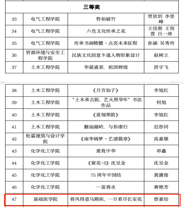 经评审,本次大赛衡阳医学院选送的9个作品获奖,其中《长安遗梦》、《共庆华诞》和《清平乐·六盘山》荣获一等奖,《祖国万岁》、《华韵新篇》、《红色力量》和《毛泽东·词两首》荣获二等奖,《春风得意马蹄疾,一日看尽长安花》荣获三等奖。中一直以来,学院注重加强研究生文化素质培养,本次比赛的优异成绩必将进一步浓厚学院文化氛围,助力研究生培养。