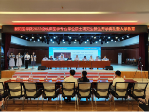 五黄六月,火伞高张,南华大学在这个生意盎然,热情洋溢的季节里迎来了全新的邂逅。6月30日下午,衡阳医学院2022级临床医学专业学位硕士研究生新生开学典礼暨入学教育分别于主会场—学生活动中心和分会场—图书馆学术报告厅隆重举行。南华大学副校长、衡阳医学院党委书记姜志胜,南华大学副校长、衡阳医学院院长王福俤,南华大学研究生院院长李乐,衡阳医学院党委常务副书记曾国,衡阳医学院党委副书记卢清华,衡阳医学院人才培养办副主任张弛,第一临床学院副院长谭钢,第二临床学院副院长唐小卿,南华临床学院副院长陈勇军,导师代表——附一医院肾内科邓进,衡阳医学院、附一、附二、南华医院全体研究生辅导员以及全体2022级临床专硕研究生共同参加本次活动。开学典礼由副校长姜志胜主持。