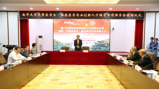 10月16日上午,南华大学免费医学生·临床医学专业创新人才培育专项奖学金捐赠仪式在第一办公楼视频会议室举行。松霖集团有限公司董事长周华松校友、副董事长吴文利,校党委书记高山、校长张灼华出席捐赠仪式,校党委委员、副校长陈国民主持。