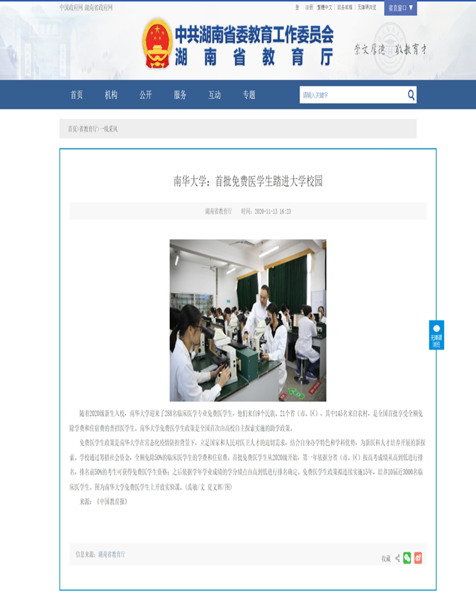 随着2020级新生入校,南华大学迎来了288名临床医学专业免费医学生,他们来自9个民族、21个省(市、区),其中145名来自农村,是全国首批享受全额免除学费和住宿费的普招医学生。南华大学免费医学生政策是全国首次由高校自主探索实施的助学政策。