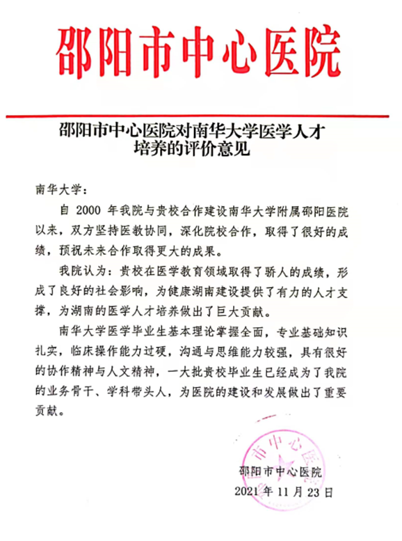 邵阳市中心医院关于南华大学医学人才培养评价