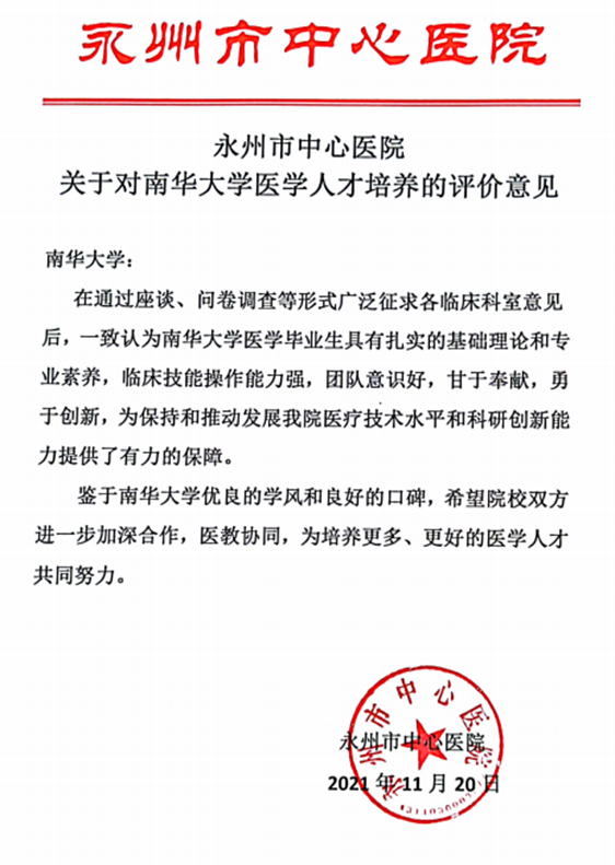 永州市中心医院关于南华大学医学人才培养评价