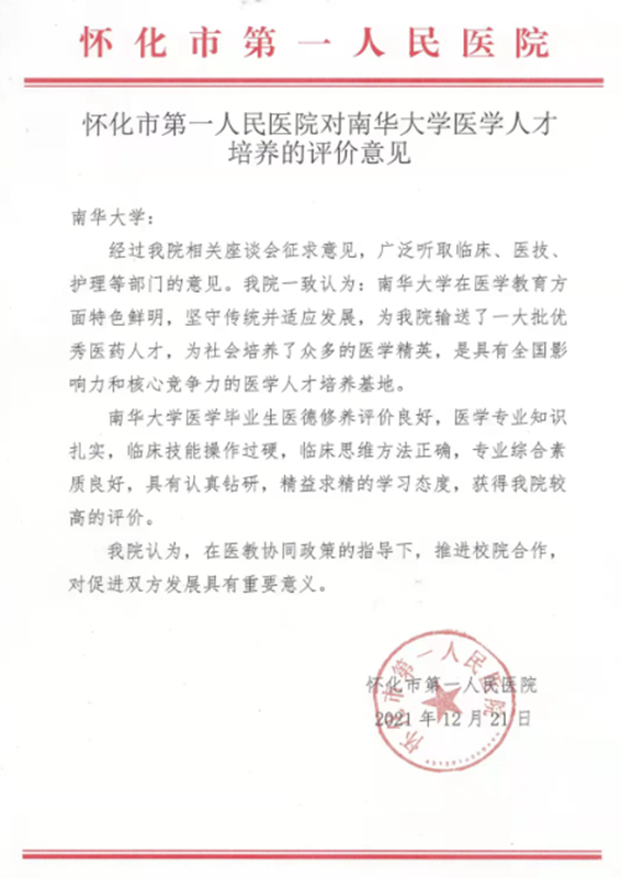 怀化市第一人民医院关于南华大学医学人才培养评价