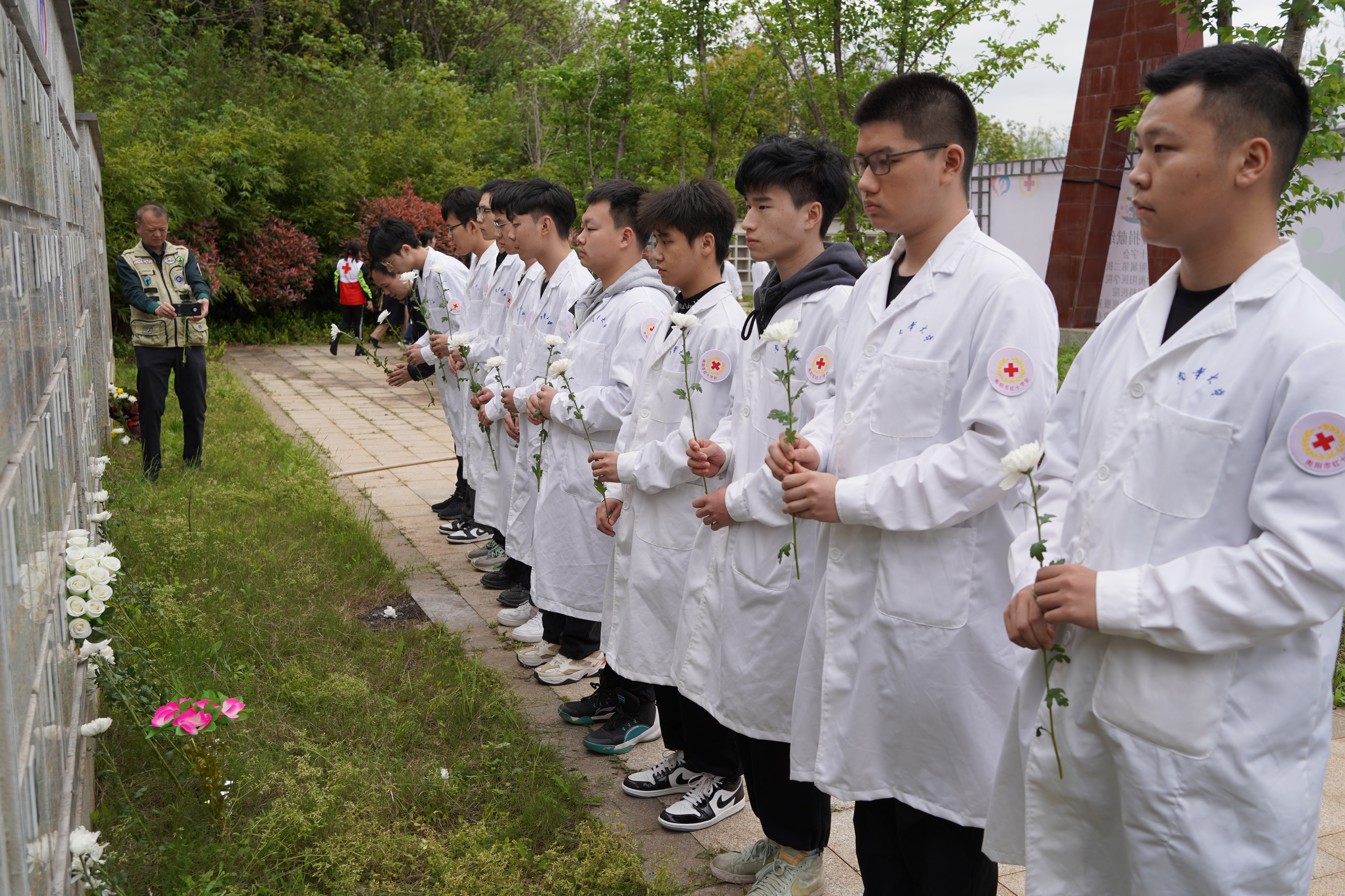 最后,学院师生身着白大褂,手握白菊,整齐站在记录着器官捐献者姓名和照片的墓碑前,怀着崇敬的心情鞠躬、献花,表达对捐献者的哀思和敬意。器官遗体捐献是一项社会公益事业,医学生们应牢记捐献者们的付出,在未来的医学生涯中更加严谨务实,不断钻研求索,为祖国医药卫生事业的发展与人类身心健康奋斗终生。